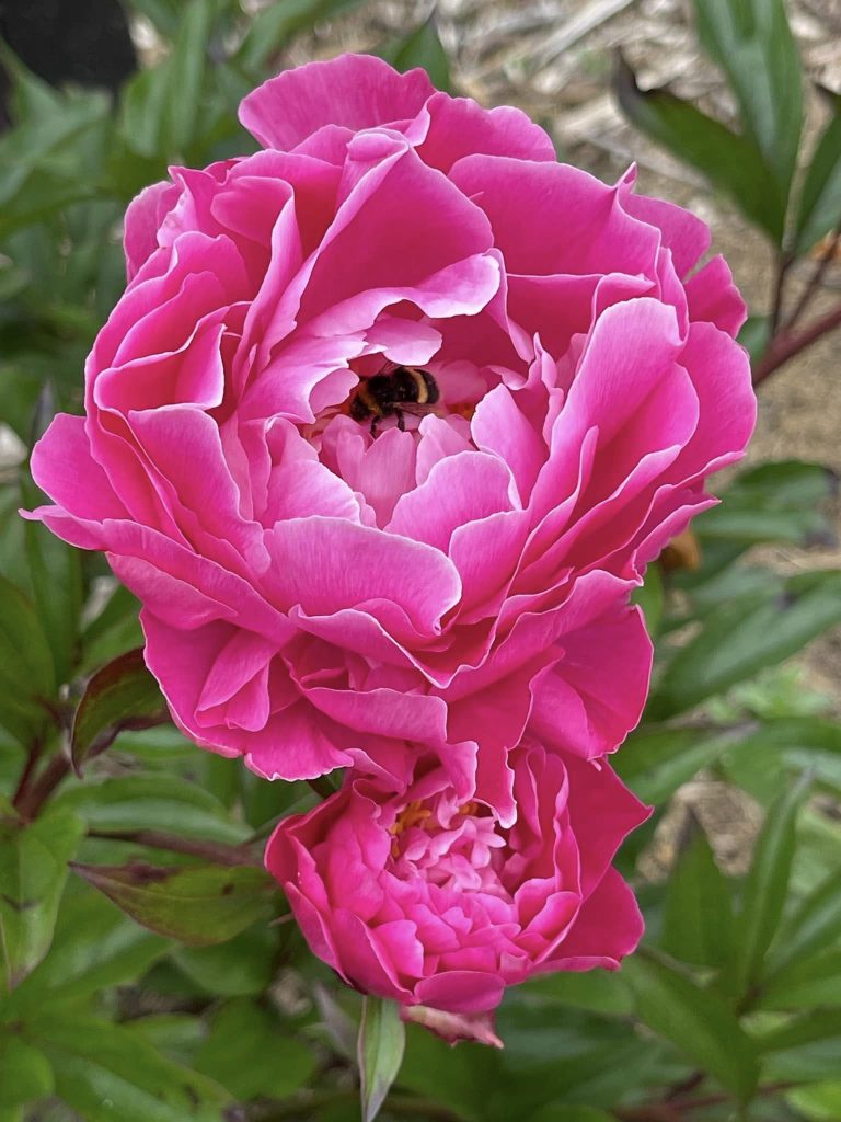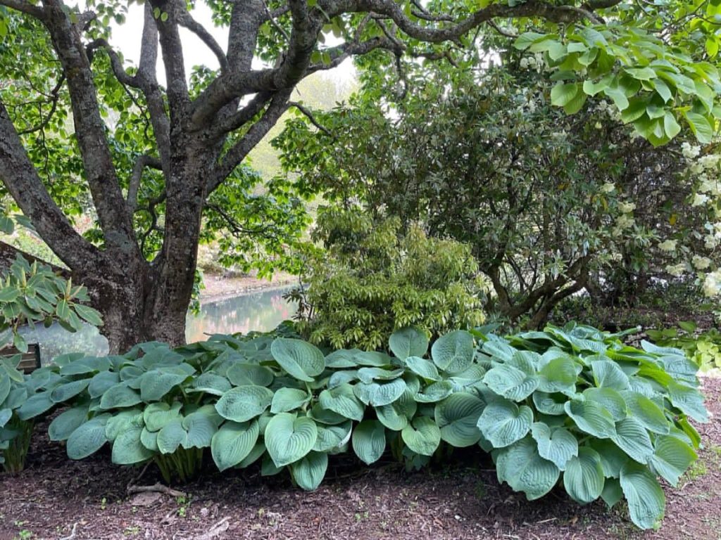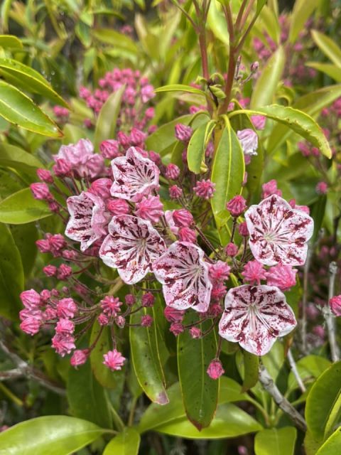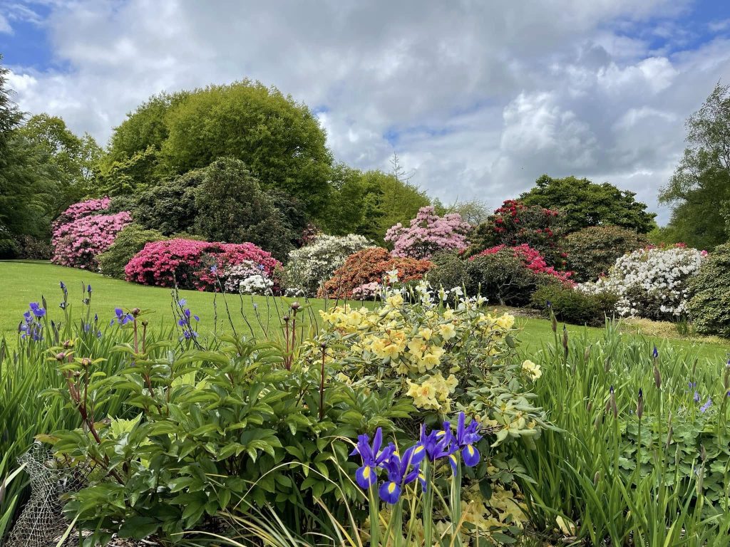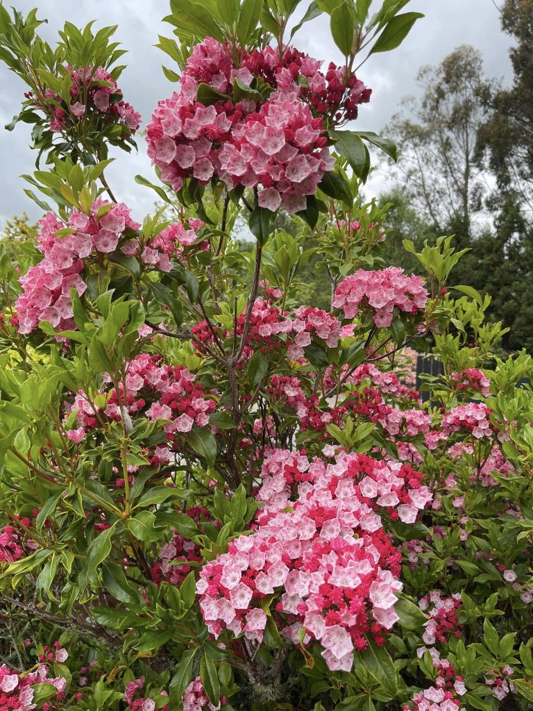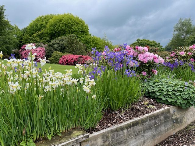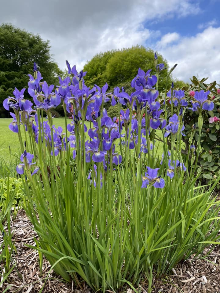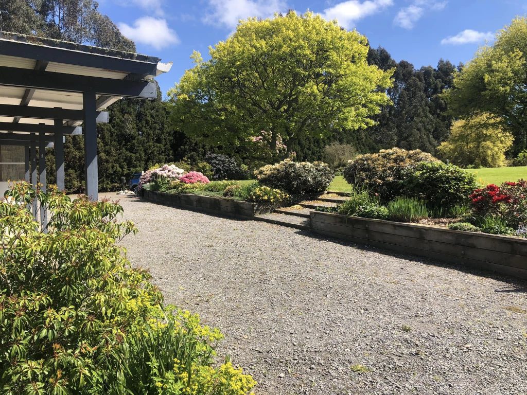 A long perennial border is located on the edge of the lawn area immediately in front of the Chalet. The garden has wide assessable steps to the front lawn and was created over 2007-2008 by a small group of Heritage Park volunteers including Olive Bayly who oversaw the maintenance of the garden until 2018. The purpose was to provide a show garden for small rhododendrons and associated perennials suitable for today's smaller gardens. Species include a range of Iris siberica, Iris innominata, Iris kaempferis, Geranium, Sisyrinchium, Stoksia, and Epimedium varieties, and new breeds of Eucomis (donated by Manawatu plant breeder Eddie Welsh). A collection of 10 different varieties of Kalmia (donated by Bill Robinson of Tikitere Nursery Rotorua) was added to the western shadier part of the border. Larger ground covering perennials such as hostas, Solomon's seal, hellebores, Brunneria, Disporum and Disporopsis can be found in rhododendron beds throughout the gardens.